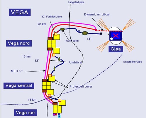 Subsea 7’s umbilical system for the Vega Project, a daisy-chained installation including flowline expansion spools, static umbilical, dynamic umbilical and a 3” ID MEG line, was installed during the 2009 season. At depths of approximately 380 metres in the Norwegian sector of the North Sea, the installation will service the new Gjøa floating production platform.